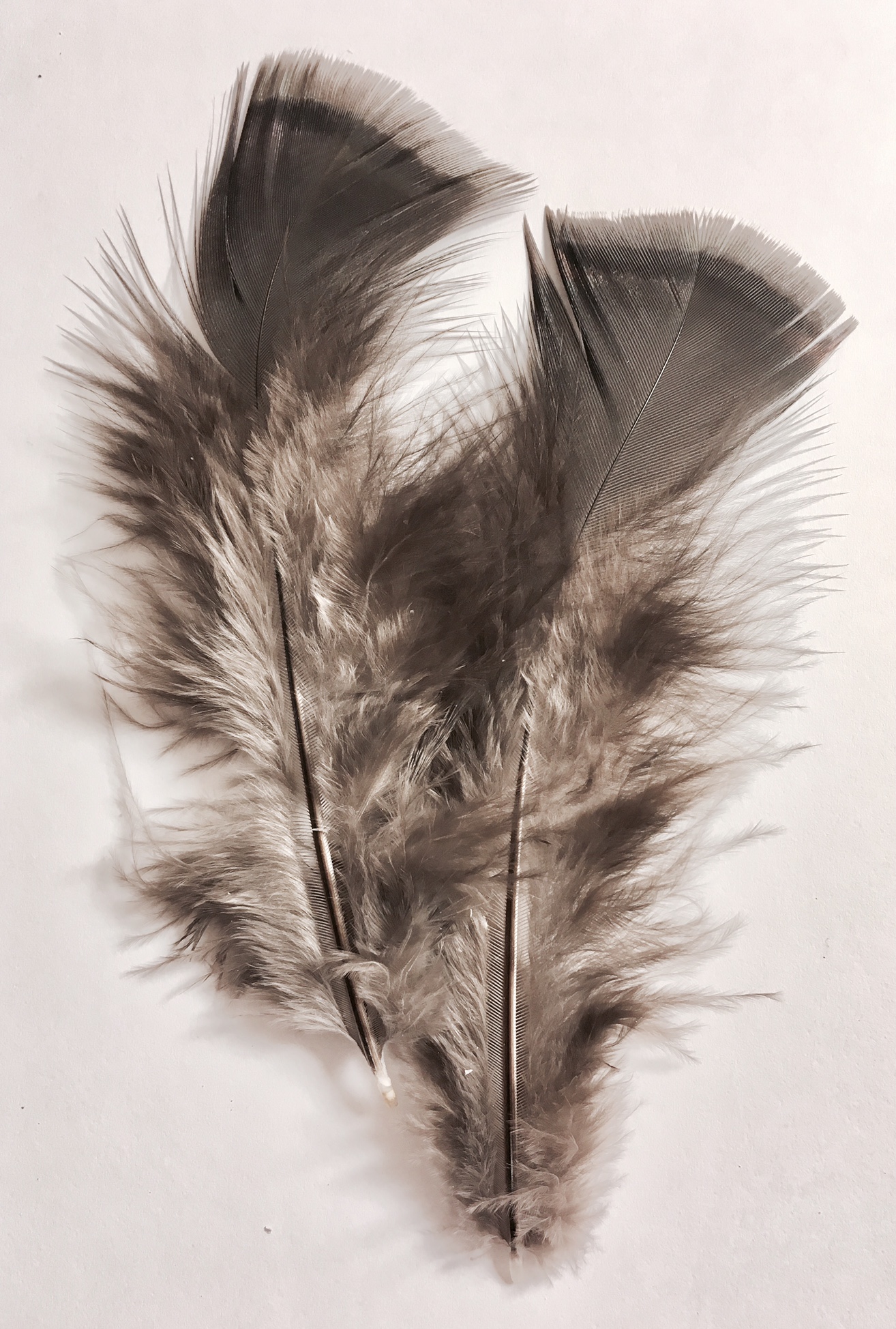 These turkey body feathers are from the standard bronze and have barred tips, some with faintly iridescent barred patterning. The vanes are fluffy and are 3 to 5 inches long, some just fluff and some tipped with the barred pattern. No tail or wing feathers, just body feathers. This item consists of one bag with @ 25 feathers, all black or gray or dark brown.