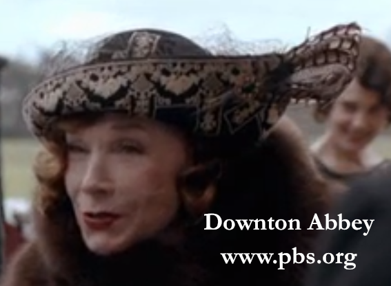 She is playing Martha Levinson, mother of Lady Grantham, and for her triumphant (for her) and dreaded (for Lady Grantham) arrival, she is wearing a magnificent feathered hat.